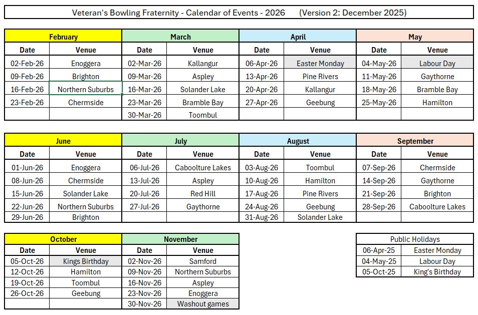 11/02/2026 – Team selections for Chermside on Monday, 23rd February 2026. Geoff Cusbert Keith Tucker Brad Story – Driving Ralph Chaplin Leaving club at 07:30AM